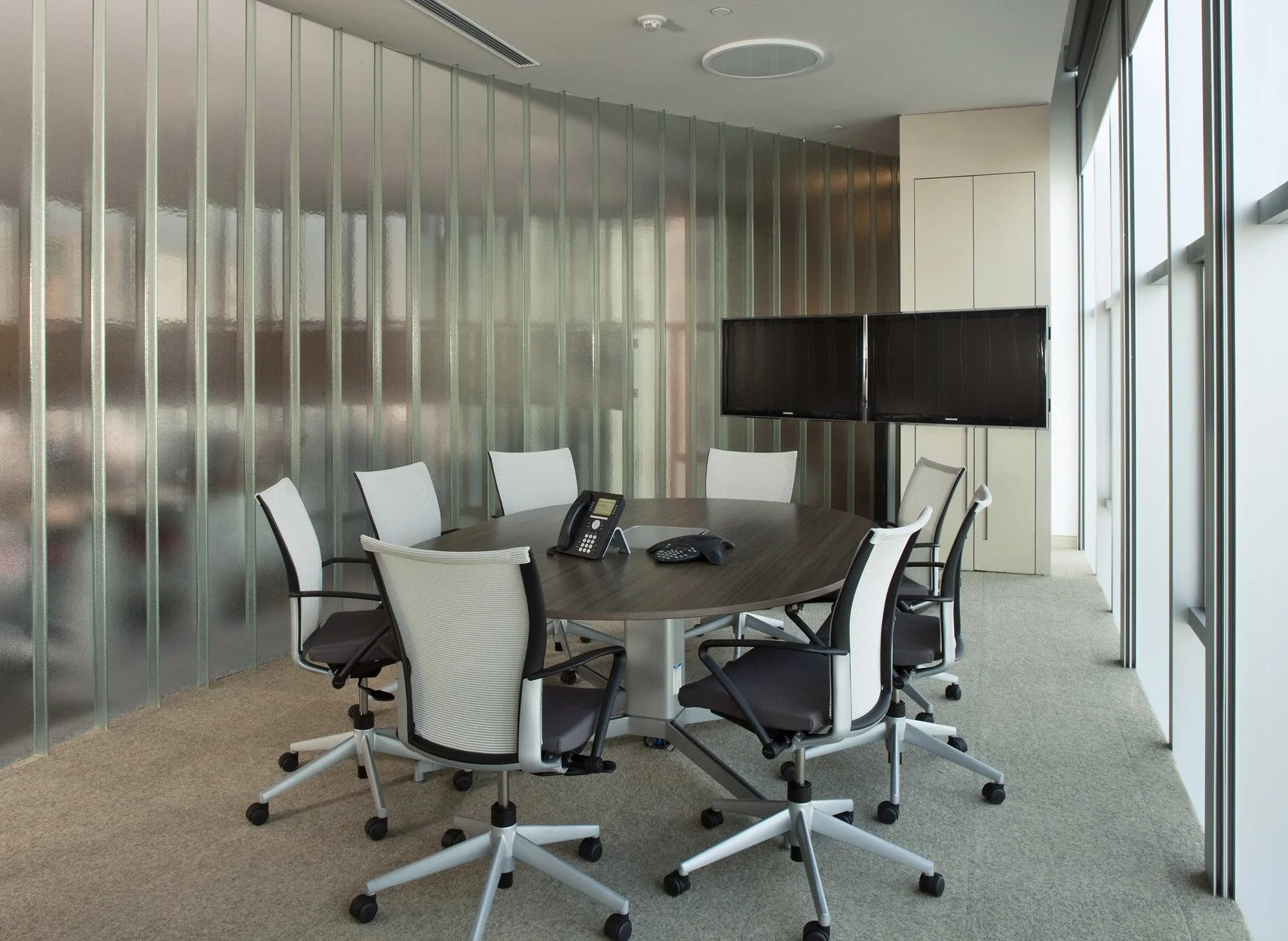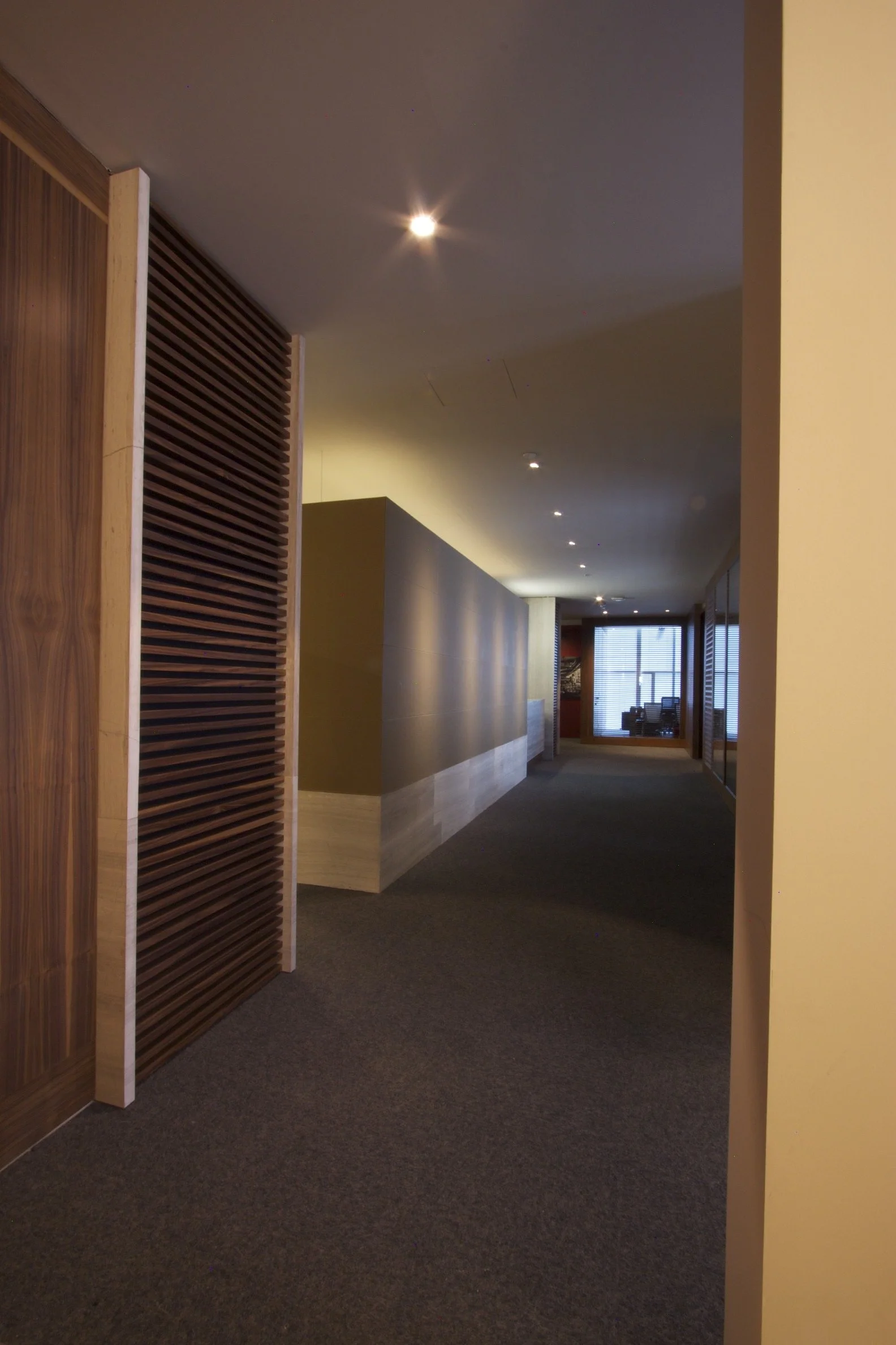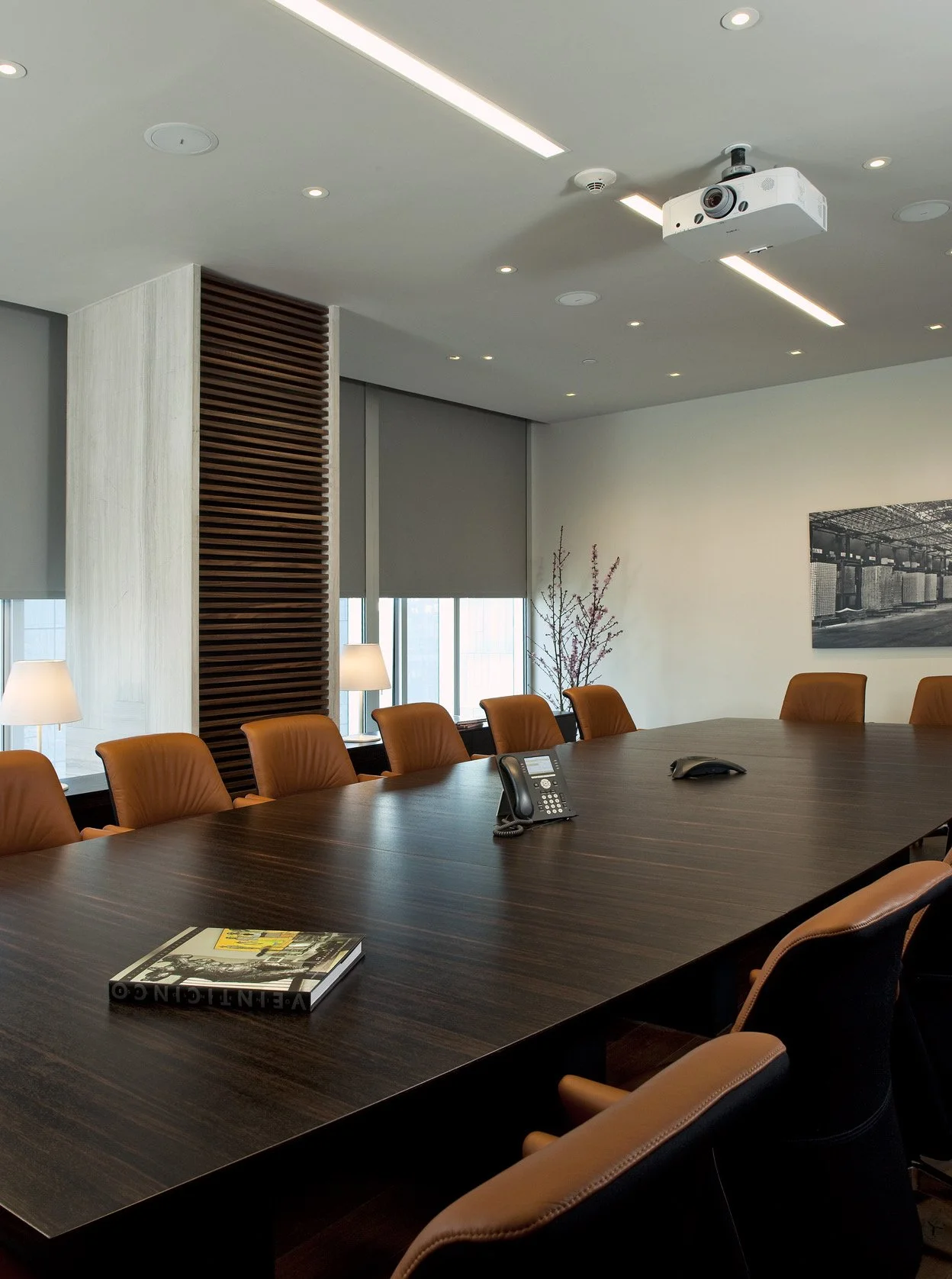 Los pisos, áreas abiertas y privados perimetrales se distinguen por muros de madera de nogal. Las salas de juntas ofrecen flexibilidad y transparencia aportando, al mismo tiempo, privacidad visual y acústica.